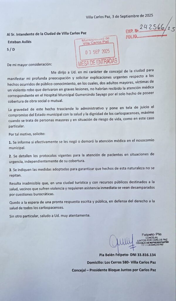 La concejal Pía Belén Felpeto exigió explicaciones a Avilés por la falta de atención médica que sufrieron dos adultos mayores en Villa Carlos Paz. El hecho, que se conoció públicamente, involucró a víctimas de un violento robo que habrían visto negada o demorada la atención en el Hospital Municipal Gumersindo Sayago por tener obra social o mutual.
